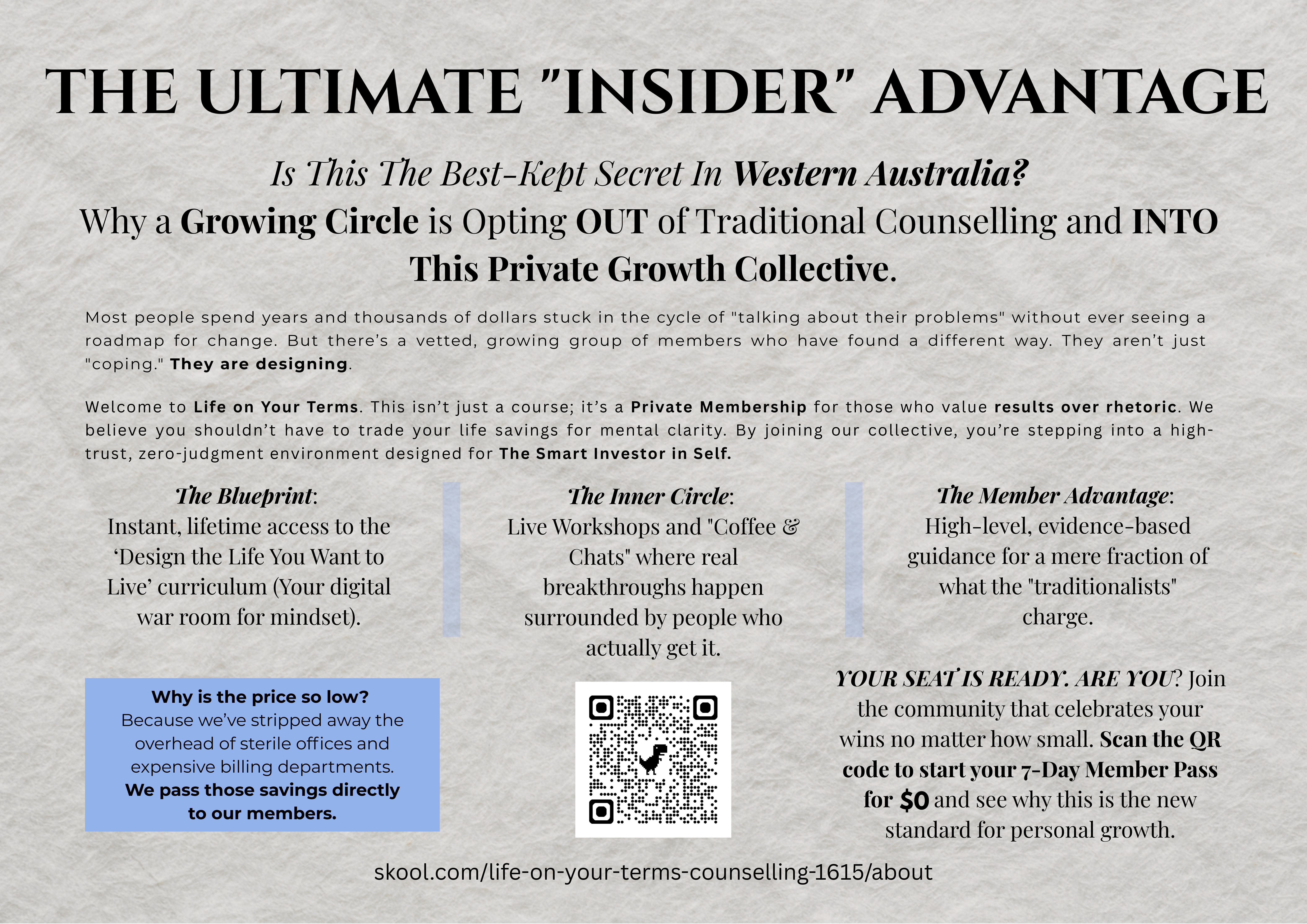 Join the Life on Your Terms Counselling Online Community and stay connected between sessions with people who value growth, self-awareness, and sustainable wellbeing. In a safe, respectful space, you can engage in supportive conversations, share experiences, and learn practical strategies for managing stress, emotions, relationships, and life transitions. Access curated resources, reflections, and service updates to help you stay informed and motivated wherever you are. This community offers encouragement, accountability, and a sense of belonging-so you can move forward with clarity, confidence, and purpose.